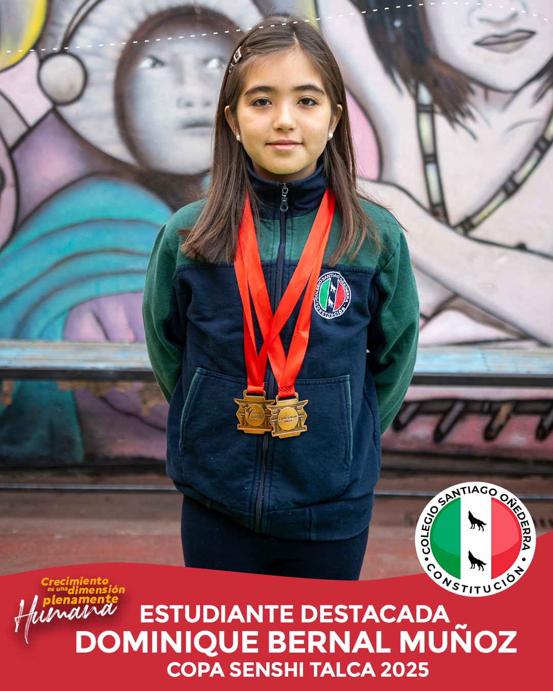 El Colegio Santiago Oñederra saluda y reconoce los logros deportivos de la estudiante Dominique Bernal Muñoz del curso 3°A quién participó del torneo de karate Kumite Copa Senshi Talca 2025. La estudiante compitió en 2 categorías obteniendo en ambas un 3° lugar. ¡Felicitaciones! 🥋🥉