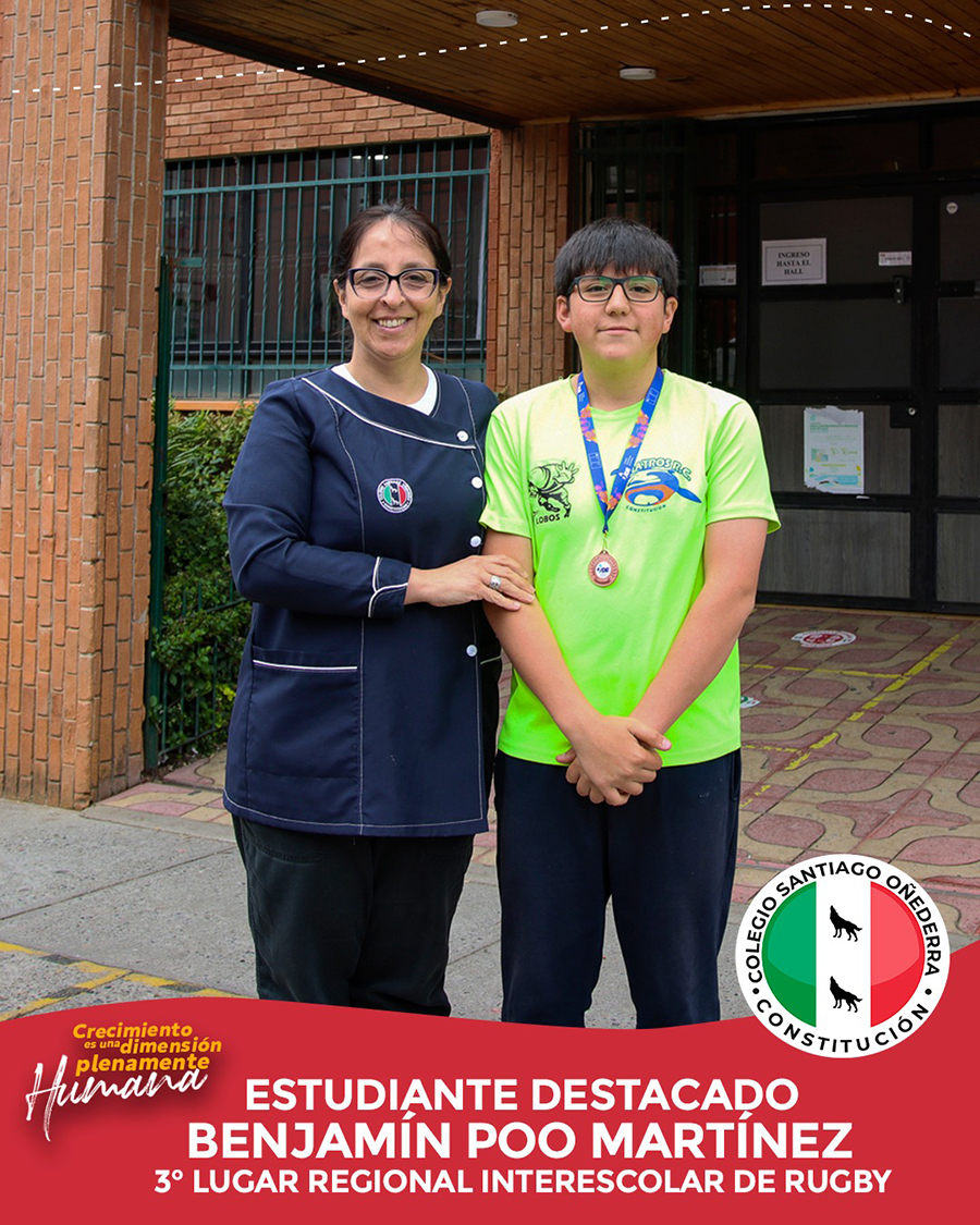 El Colegio Santiago Oñederra saluda y reconoce los logros deportivos del estudiante Benjamín Poo Martínez quien junto a su equipo Albatros Lobos de Constitución obtuvieron un 3° lugar regional en la categoría sub 14 en el interescolar de Rugby organizado por Instituto Nacional del Deporte ¡Felicitaciones! 🏈🥉